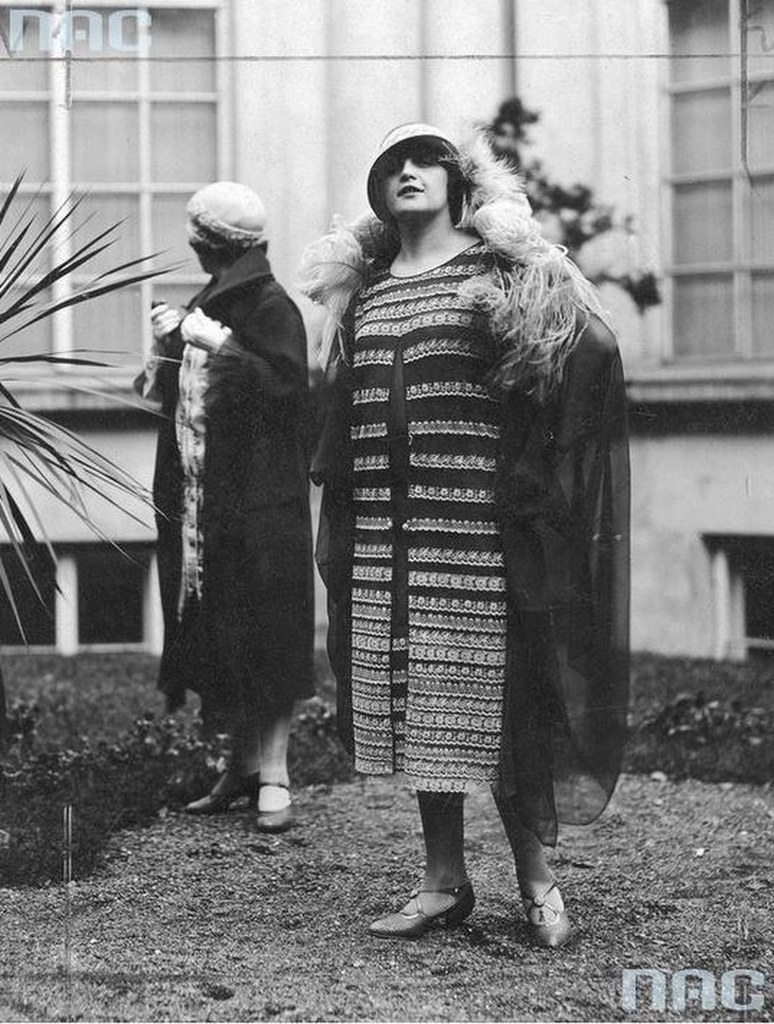 Kobieta w jesiennym płaszczu prezentuje ekscentryczne zdobienia na nogach / Fot. Narodowe Archiwum Cyfrowe