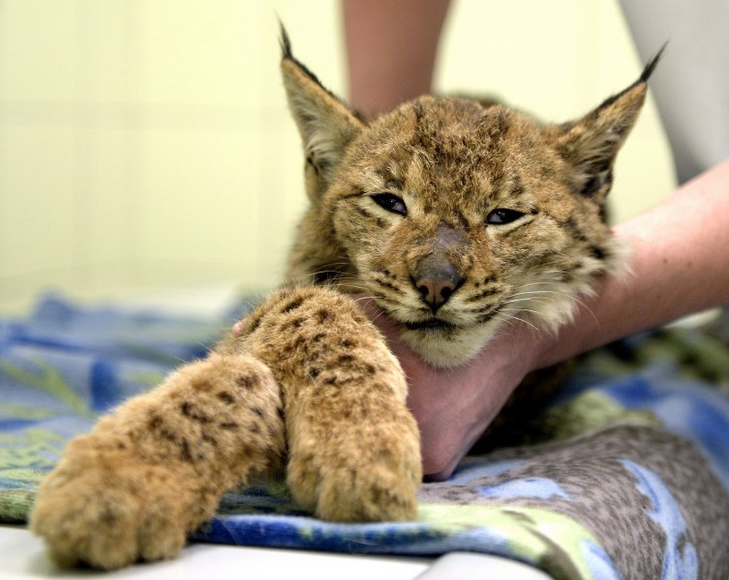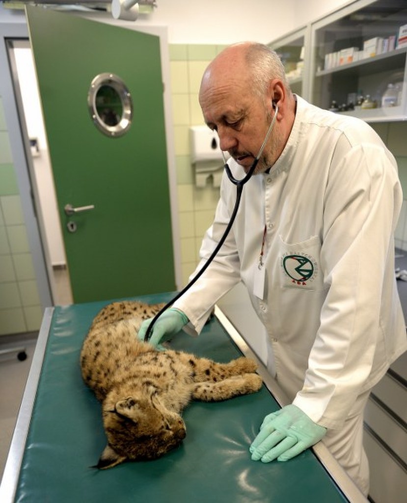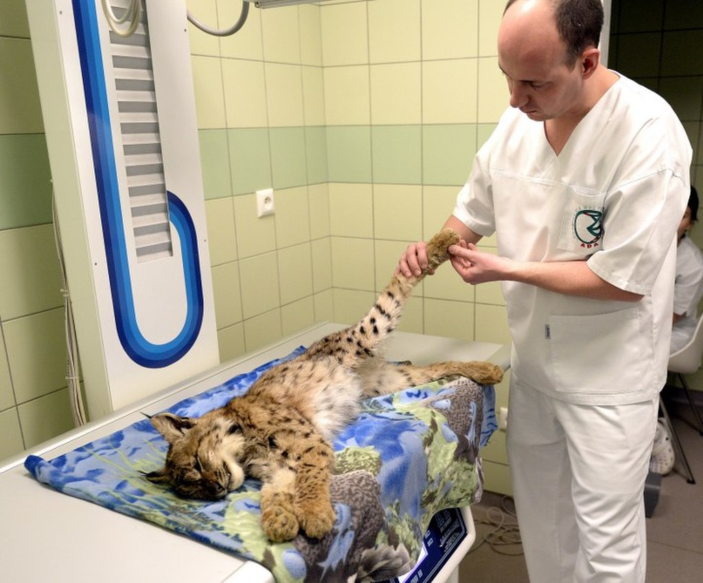 Lek. wet. Andrzej Fedaczyński podczas badania, będącej pod działaniem środka nasennego, około 1,5-rocznej samicy rysia, przywiezionej do Ośrodka Rehabilitacji Zwierząt Chronionych w Przemyślu. Drapieżnik, który prawdopodobnie stracił matkę, atakował drób u rolników w miejscowości Polana w Bieszczadach, gdzie też został odłowiony. W czasie badania w ośrodku specjaliści stwierdzili u samicy złamanie kości udowej.