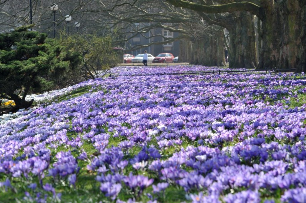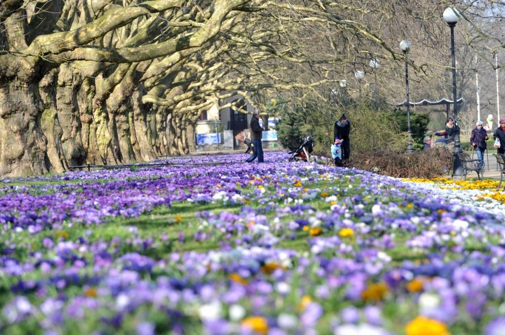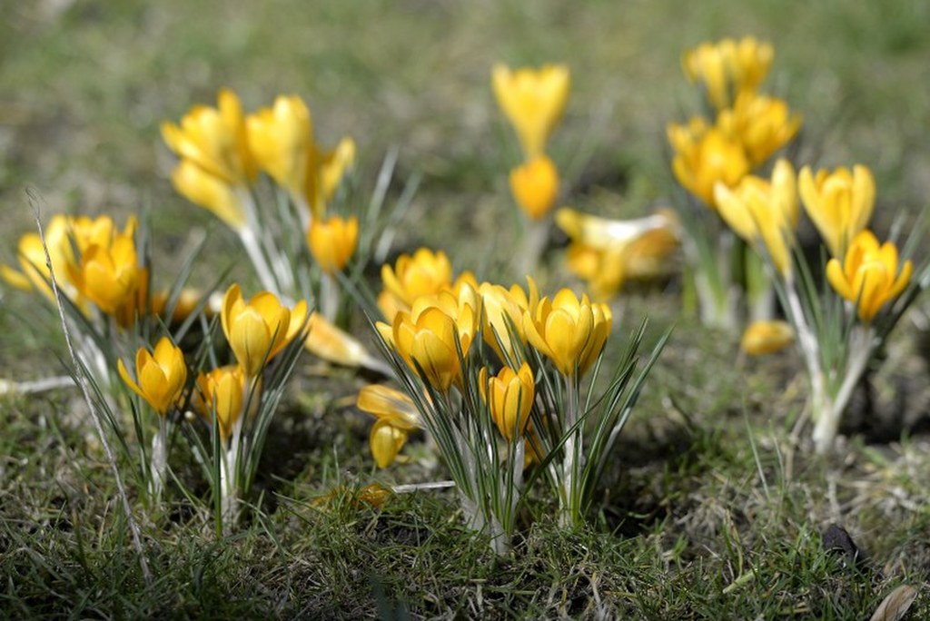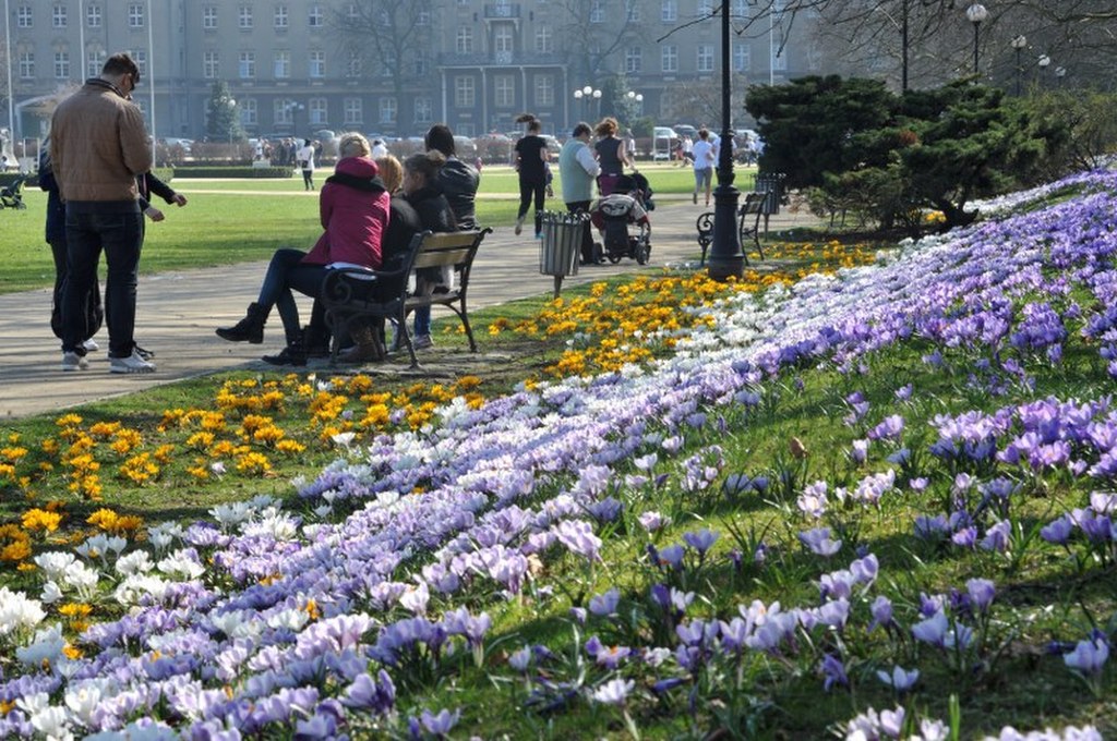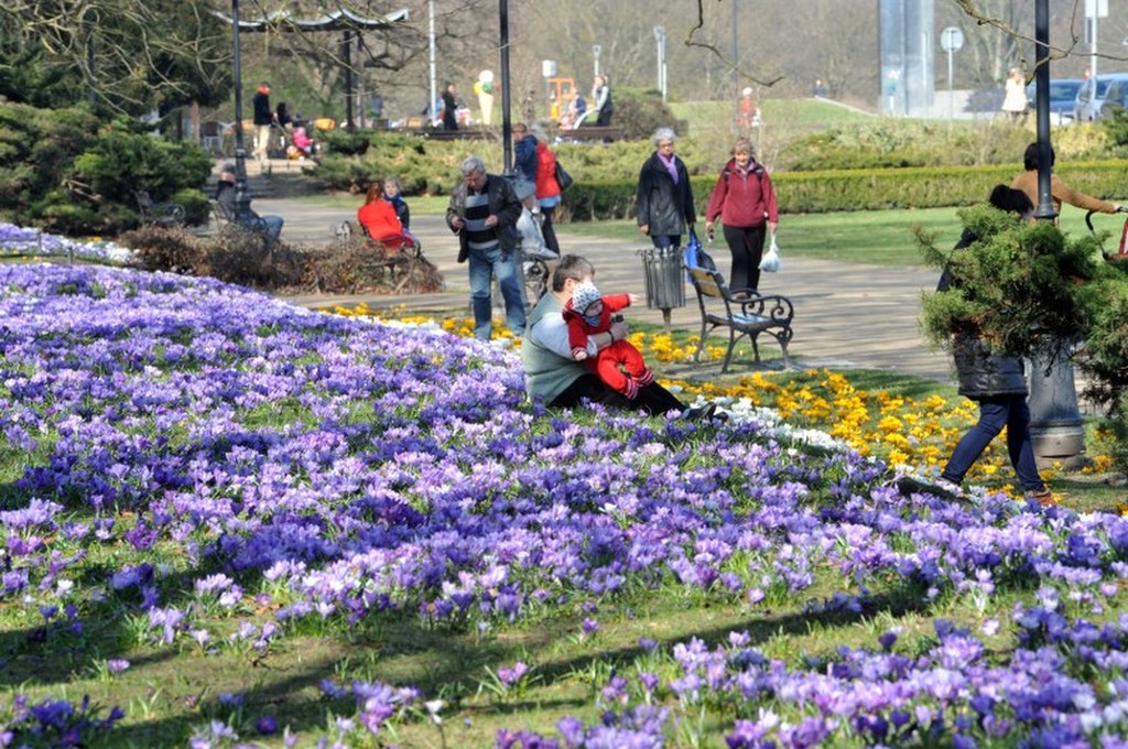 Krokusy na trawniku w Przemyślu. / fot. Darek Delmanowicz/PAP / PAP