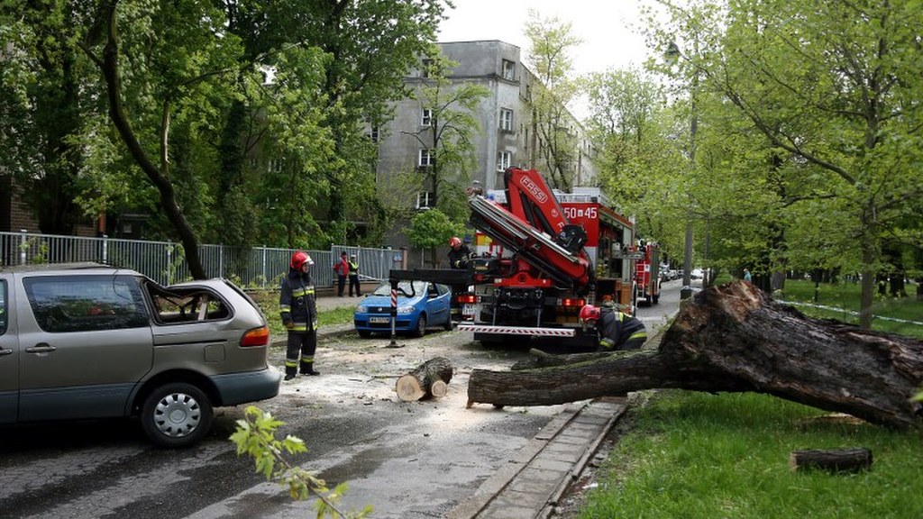Strażacy usuwają drzewo, które spadło na przejeżdżającą taksówkę w alei Wojska Polskiego w Warszawie, przy skrzyżowaniu z Bitwy pod Rokitną. Do zdarzenia doszło wczoraj późnym popołudniem. Uszkodzone zostały też dwa inne samochody. W wypadku nikt nie został ranny.
