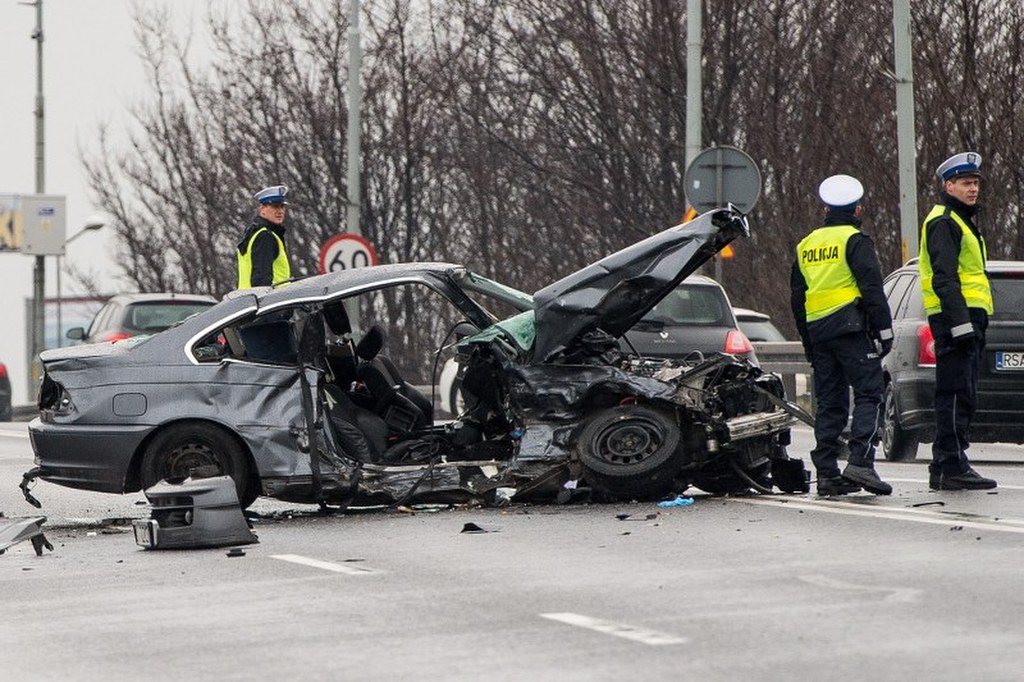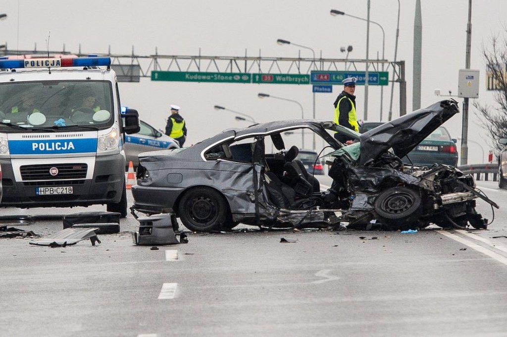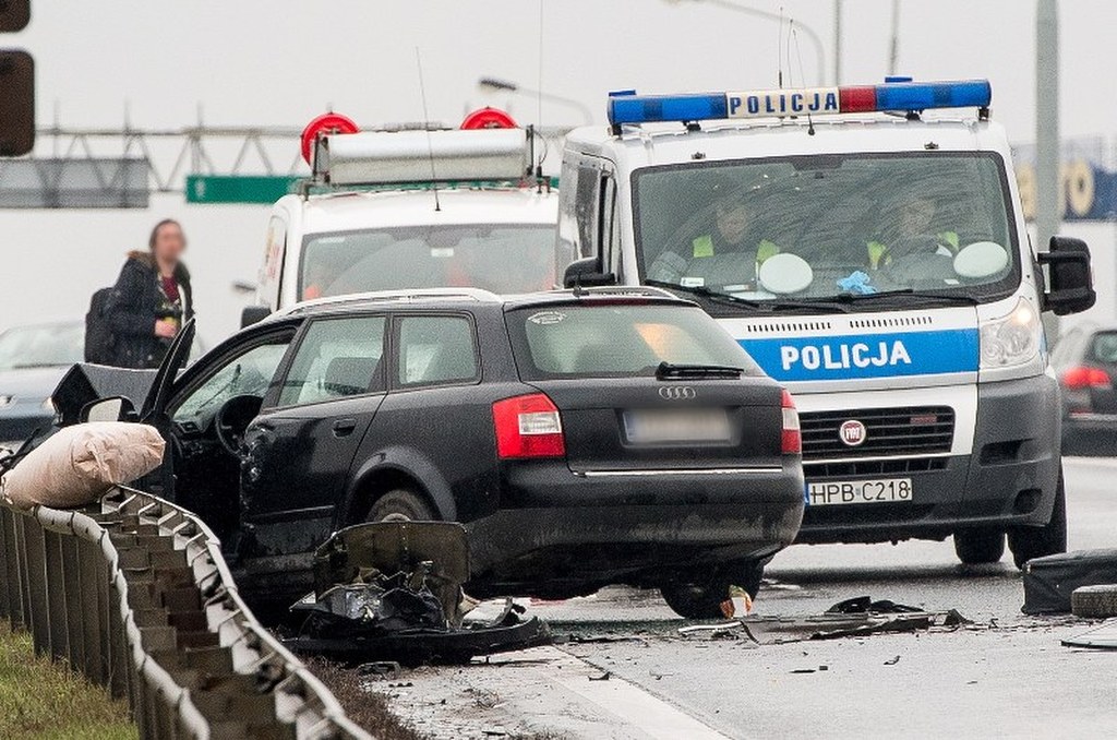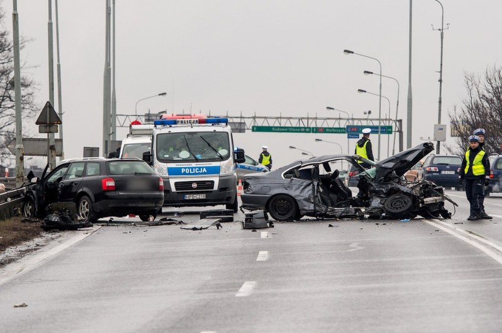 Miejsce tragicznego wypadku na wiadukcie nad autostradą A4 we Wrocławiu. W wyniku zderzenia audi i bmw zginęła jedna osoba, a dwie trafiły do szpitala.
