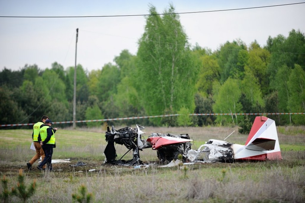 Wrak awionetki dzień po wypadku w okolicach miejscowości Mingosy (woj. mazowieckie). Maszyna zaczepiła o linie średniego napięcia i zapaliła się. Pilot zdołał opuścić maszynę samodzielnie i ranny został przewieziony do szpitala.