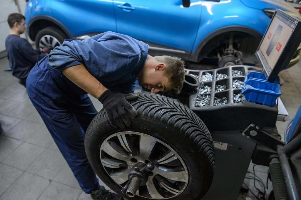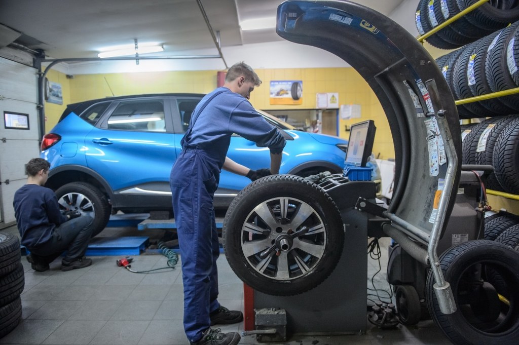 Wymiana opon w jednym z lubelskich zakładów wulkanizacyjnych. Zima coraz bliżej, w zakładach wulkanizacyjnych coraz większy tłok, na wymianę opon trzeba umawiać się z kilkudniowym wyprzedzeniem.