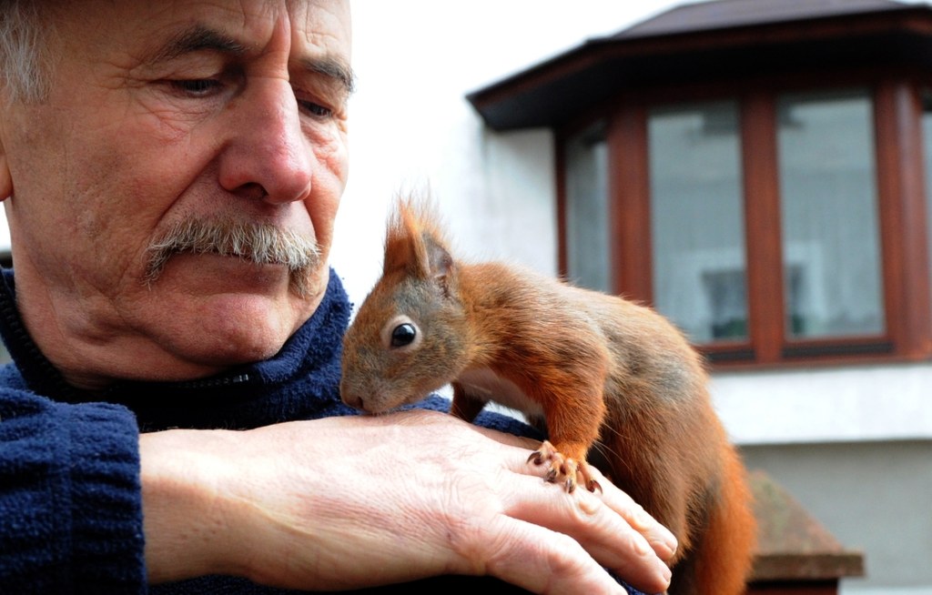 Pan Tadeusz Łubiasz ze Szczecina trzy lata temu, podczas spaceru, znalazł malutka wiewiórkę, która leżała na drodze. Po wyleczeniu, wiewiórka została u niego w domu.