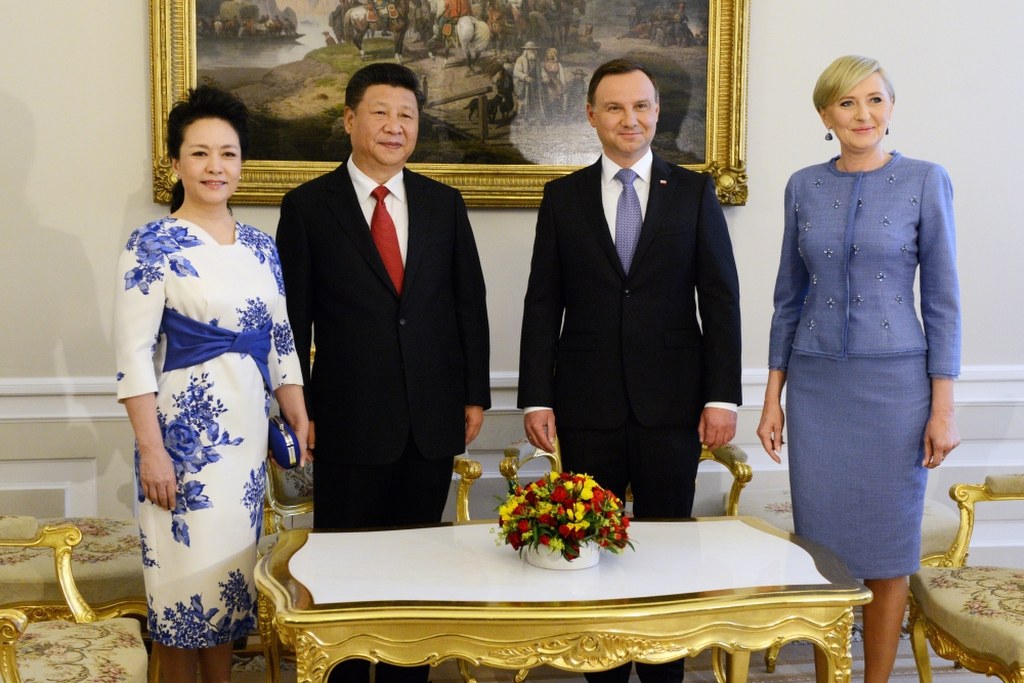 Prezydent Andrzej Duda, z małżonką Agata Kornhauser-Dudą i przewodniczący Chińskiej Republiki Ludowej Xi Jinping, podczas ceremonii oficjalnego powitania na dziedzińcu Pałacu Prezydenckiego w Warszawie / fot. Jacek Turczyk / PAP