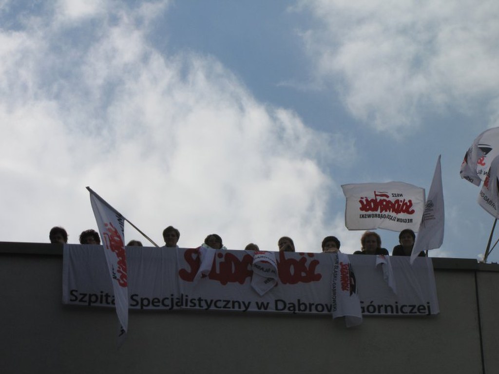 Protestujące w Dąbrowie Górniczej salowe oraz wspierająca je manifestacja "Solidarności". / fot. Piotr Glinkowski / RMF FM
