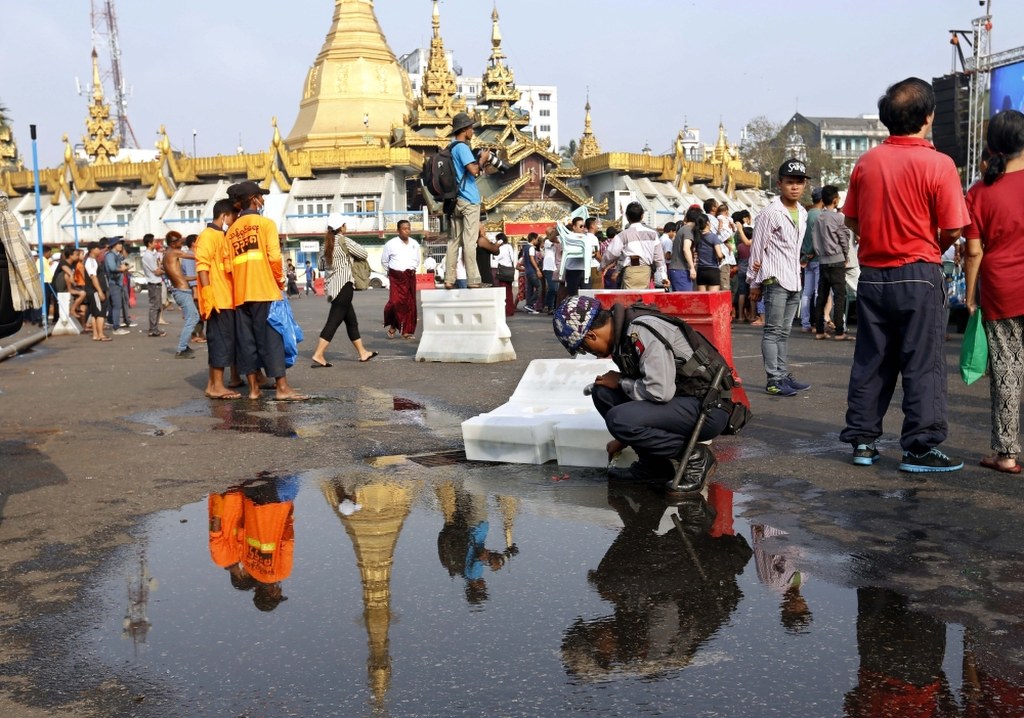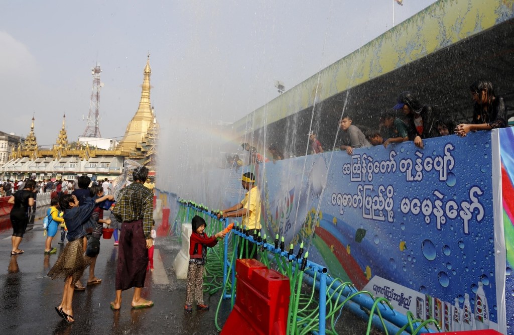 Trwa Festiwal Wody w Thingyan w Yangon, znany powszechnie jako Thingyan. Ludzie gromadzą się by przez pięć dni świętować oblewając się wzajemnie wodą. Ma to na celu oczyszczenie się z grzechów całego życia, a także rozpoczęcie hinduskiego Nowego Roku, który jest jednocześnie ostatnim dniem festiwalu. Thingyan ma genezę w hinduskiej wersji mitu o królu Brahmów, którzy przegrał zakład z Sakrą, królem bogów.