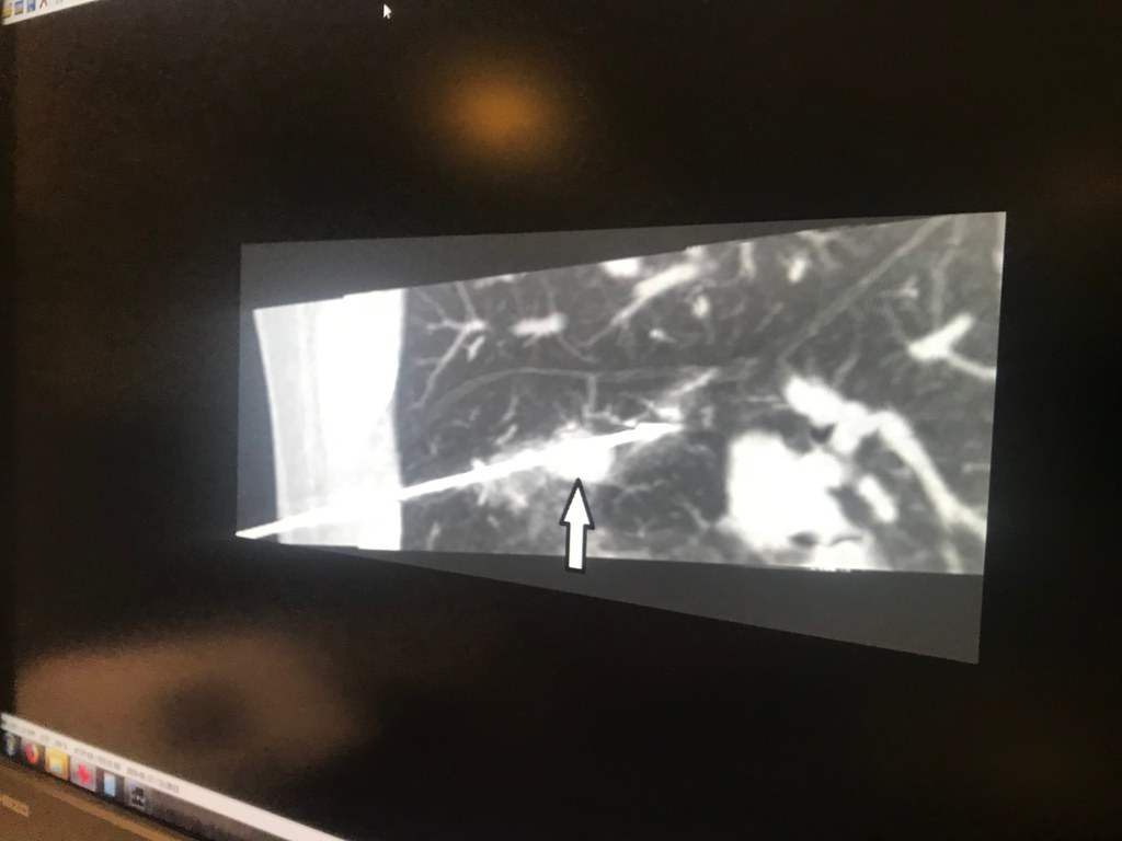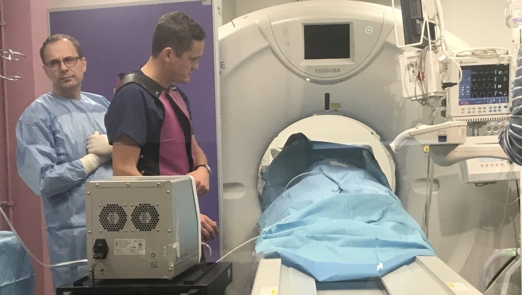 Obraz tomografii komputerowej z pionierskiego zabiegu. Widać na nim igłę, która niszczy guza znajdującego się w płucu. / fot. Michał Dobrołowicz / RMF FM