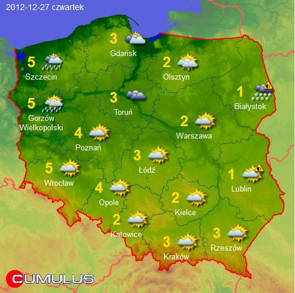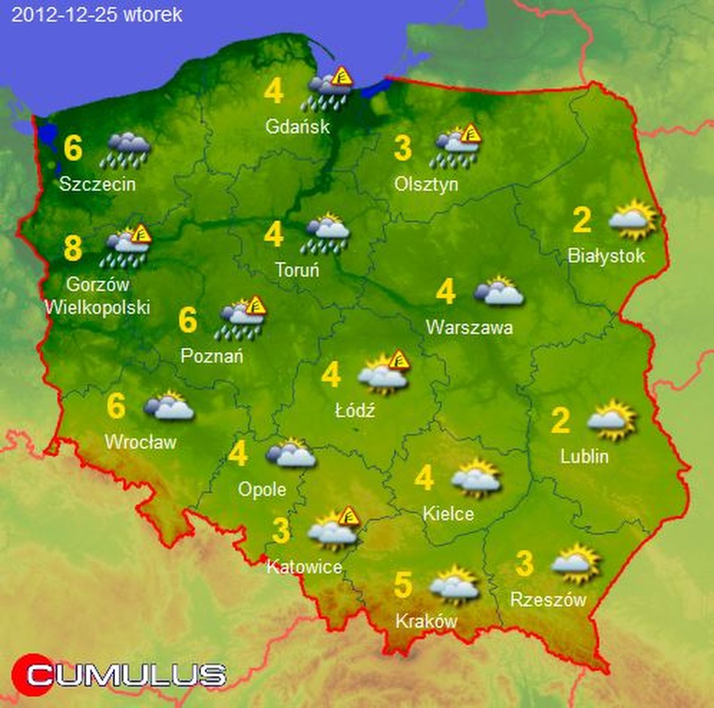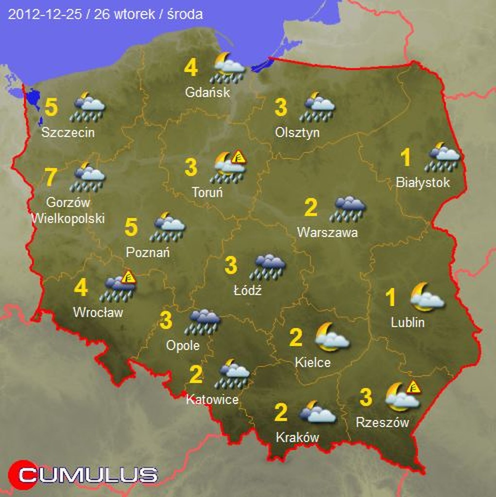 Sporo deszczu, niewiele słońca – taka pogoda czeka nas w najbliższych dniach. Niestety, w tym roku święta Bożego Narodzenia nie będą białe i mroźne. Na termometrach zobaczymy od 2 do nawet 8 kresek na plusie. Oto prognoza pogody przygotowaną specjalnie dla Was przez wrocławskie biuro Cumulus.