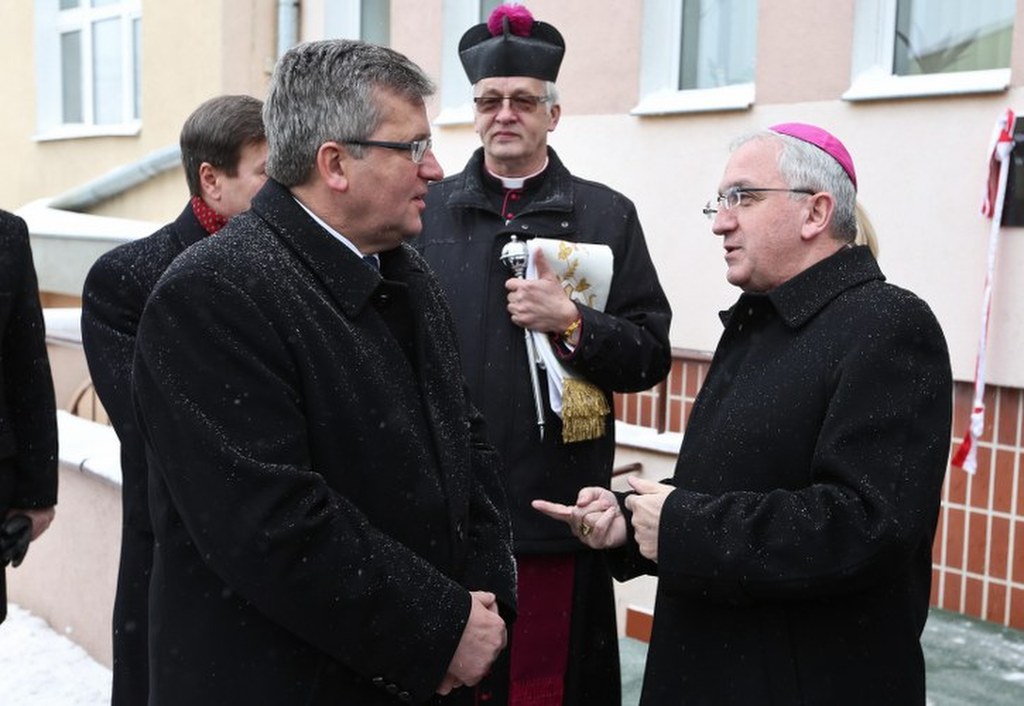 Zaborów k. Warszawy: Obchody 150. rocznicy powstania styczniowego. Na zdjęciu prezydent Bronisław Komorowski (z lewej) oraz nuncjusz papieski Celestino Migliore (z prawej) podczas wizyty w SP. im. Powstańców 1863 roku / fot. PAP/Rafał Guz