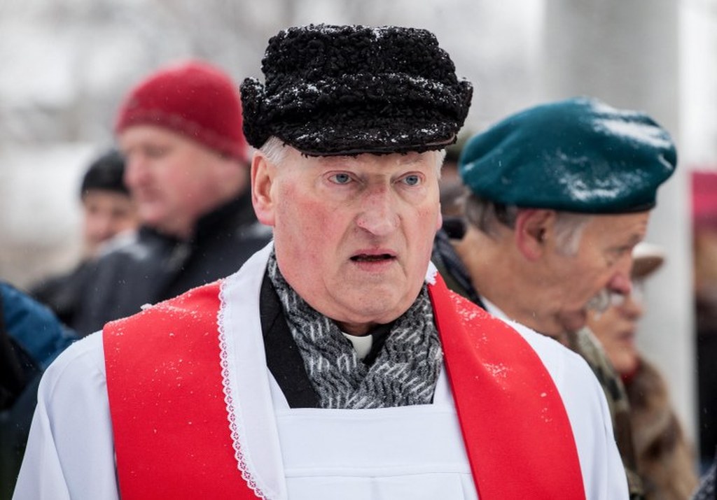 Ksiądz infułat Józef Wójcik podczas uroczystości pod krzyżem powstańczym w Suchedniowie / fot. PAP/Michał Walczak