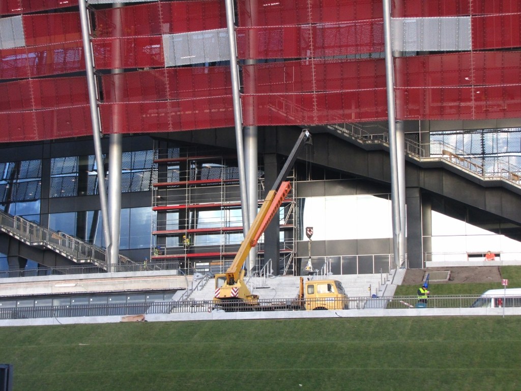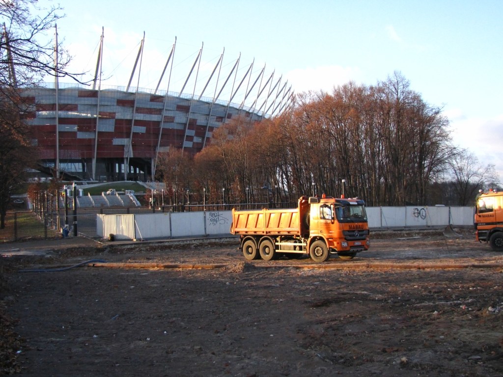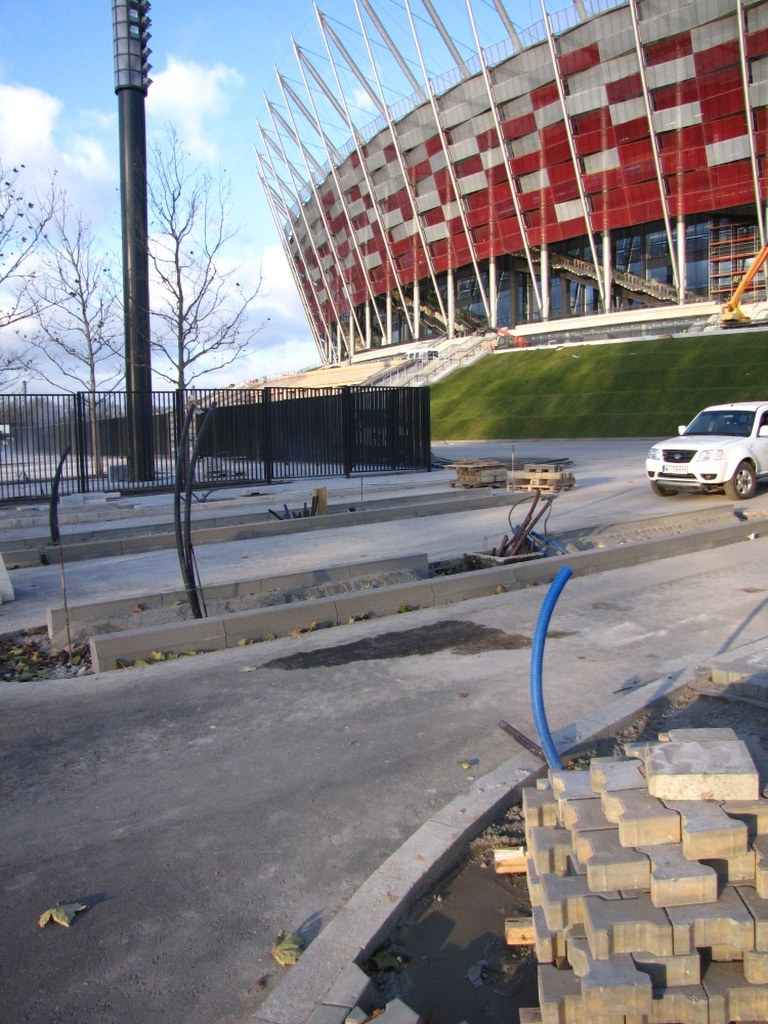 Dookoła Stadionu Narodowego wre jeszcze praca. Stoją wywrotki, koparki i małe ładowarki, a co kilkaset metrów ustawione są palety z kostką brukową, która dopiero ma być ułożona. Te prace są prowadzone poza ogrodzeniem areny i potrwają do samego Euro 2012, bo tego nie obejmuje kontrakt z generalnym wykonawcą areny.