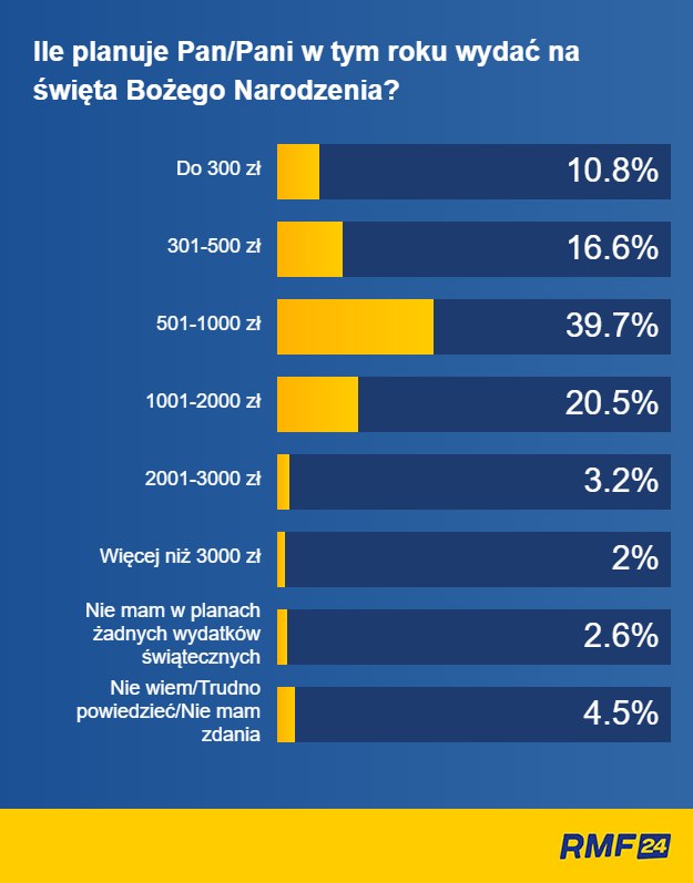 Tylko 2 proc. respondentów może sobie pozwolić na przekroczenie kwoty 3000 zł, za to aż co dziesiąty Polak (10,8 proc.) na ten świąteczny czas może wygospodarować tylko 300 zł. Więcej, bo 16,6 proc. badanych, planuje wydać od 301 do 500 zł.
