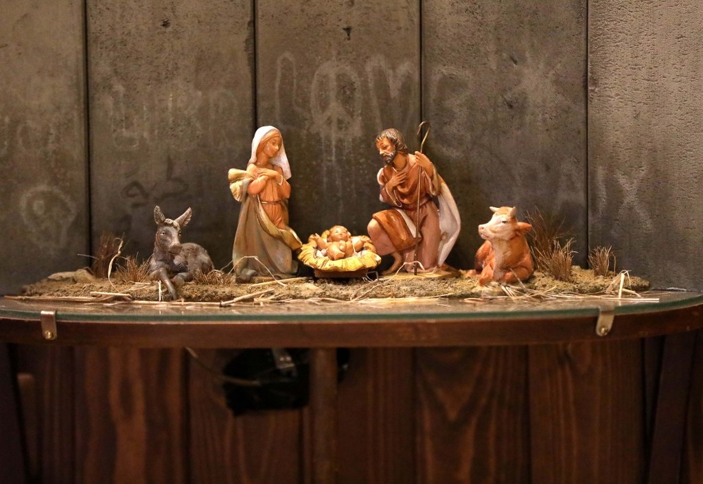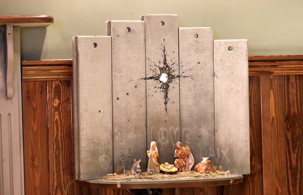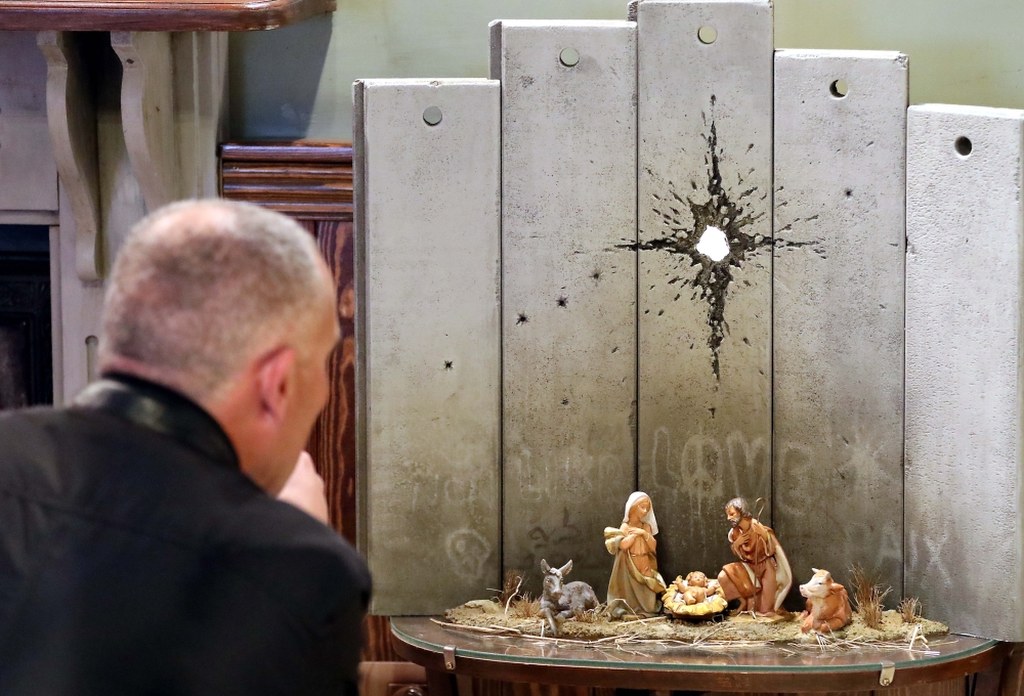 Nowa praca brytyjskiego artysty, która pojawiła się w jego hotelu w Betlejem, przedstawia Józefa i Maryję, którzy pochylają się nad dzieciątkiem. Tuż za nimi stoi betonowy mur z graffiti, a nad nim widać dziury po kulach.