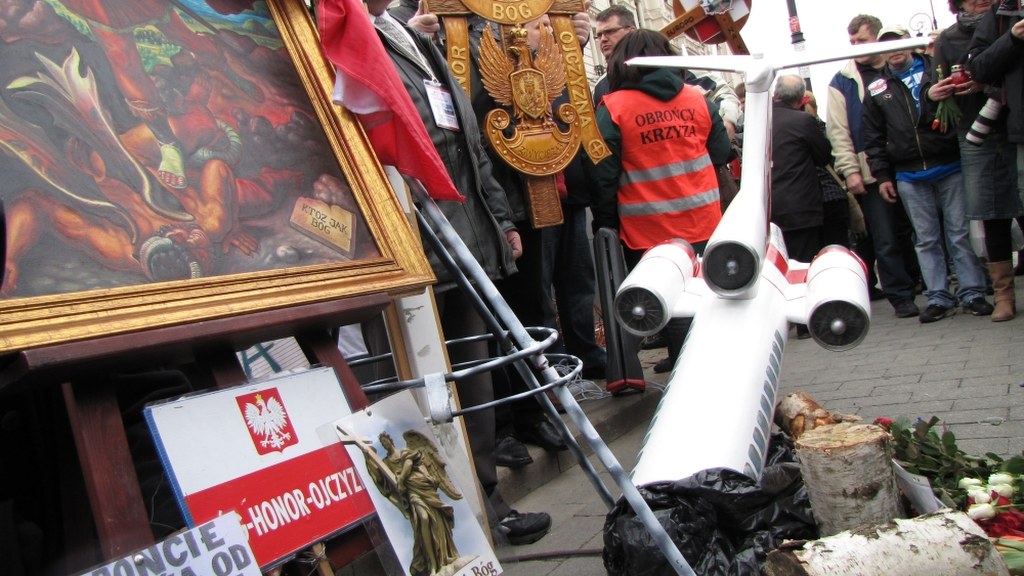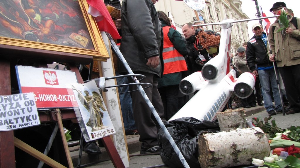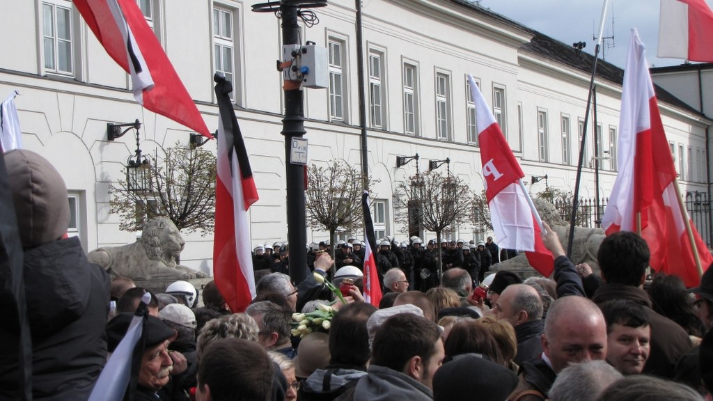 Zgromadzeni przed Pałacem Prezydenckim skandowali: "Jarosław, Jarosław" oraz: "Tu jest Polska, tu jest Polska". Parlamentarzyści PiS towarzyszący szefowi partii przenieśli zdjęcie pary prezydenckiej oraz znicze za barierki oddzielające Pałac Prezydencki od Krakowskiego Przedmieścia. Osoby, które przyszły pod Pałac, trzymają biało-czerwone flagi przepasane kirem; składają kwiaty. Niektórzy przynieśli plakaty, na jednym z nich napisano: "Od spółki Putin Tusk żądamy odtajnić Katyń prawdy smoleńskiej".
