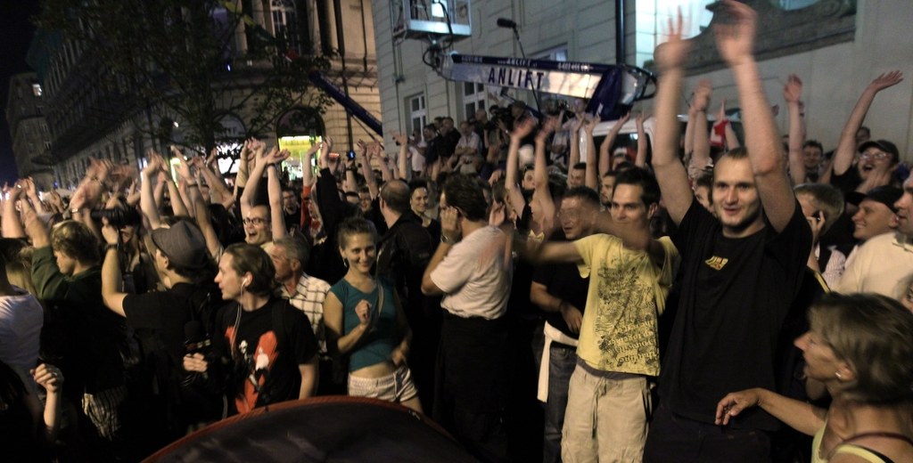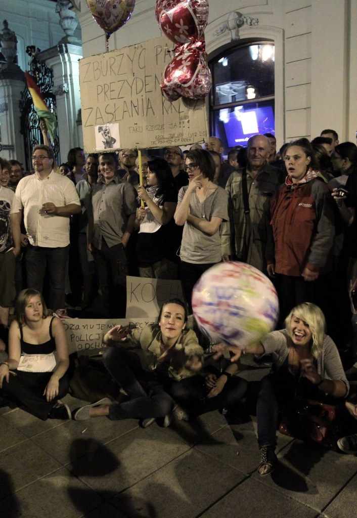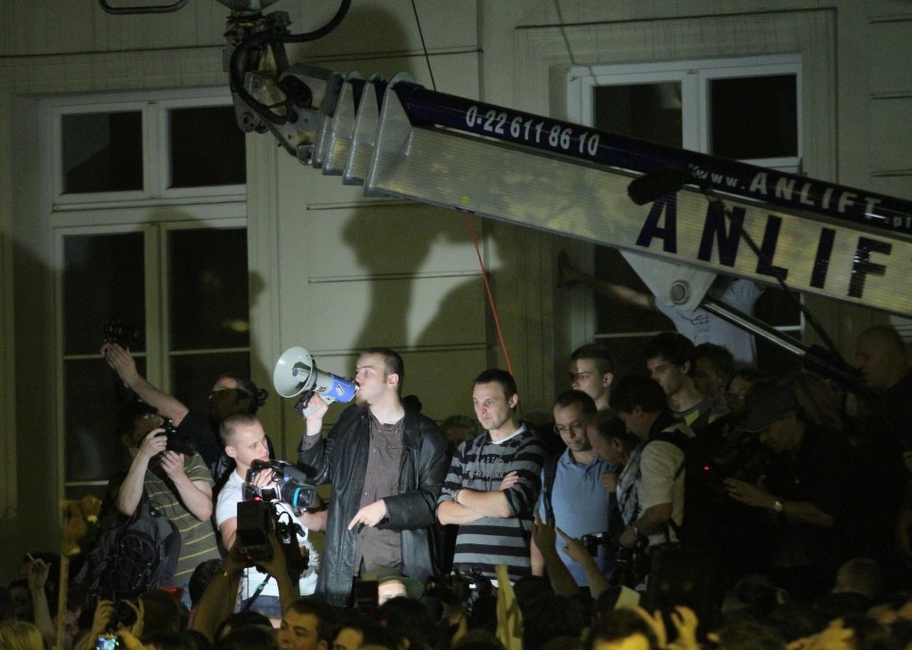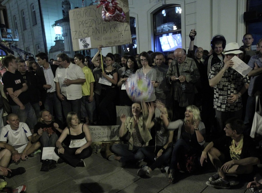 Tłum zaczął gęstnieć w poniedziałek ok. 22.00. Przychodzili ci, którzy zwołali się przez Internet, by zaprotestować przeciw krzyżowi i zwolennicy pozostawienia go pod pałacem. W tłumie domagającym się przeniesienia krzyża stała grupa z transparentem wzywającym: "Zostawicie krzyż w spokoju. Politycy zamiast skłócać Polaków spełnijcie obietnice wyborcze!".
