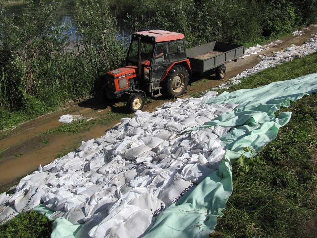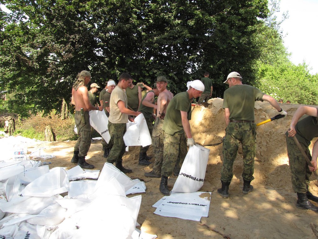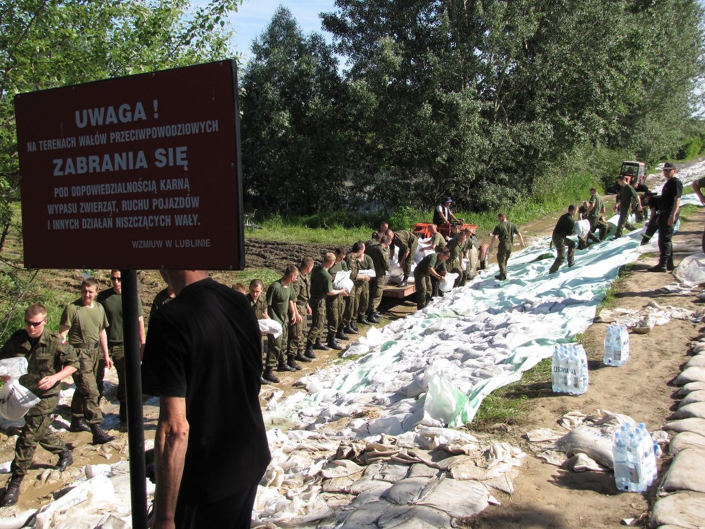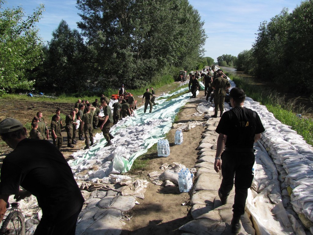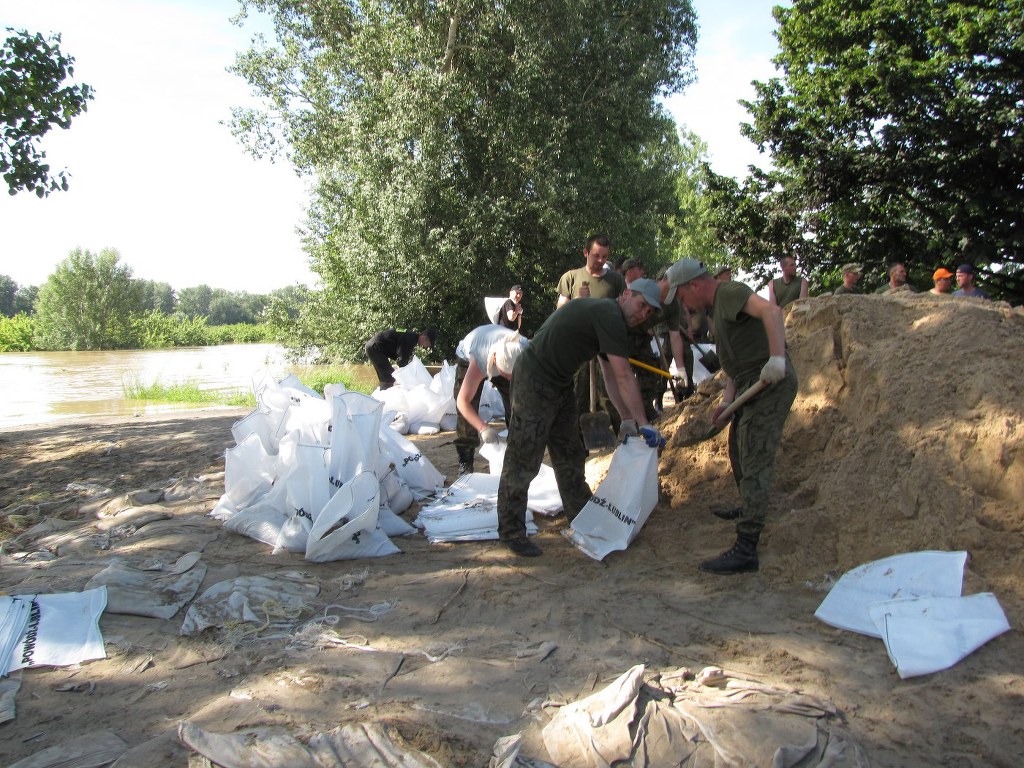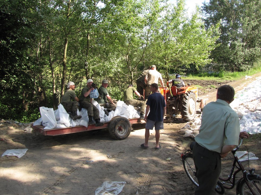 Na wałach pracuje około 500 żołnierzy, strażaków i ochotników. Co chwilę podjeżdża ciągnik z lawetą, na którą natychmiast pakowane są worki z piaskiem. Wskakują na nią żołnierze i ten transport jedzie kawałek dalej. Worki są układane w miejscach podsiąków. Rozkładana jest też specjalna włóknina.