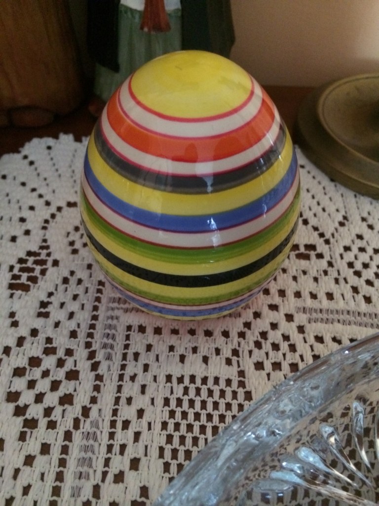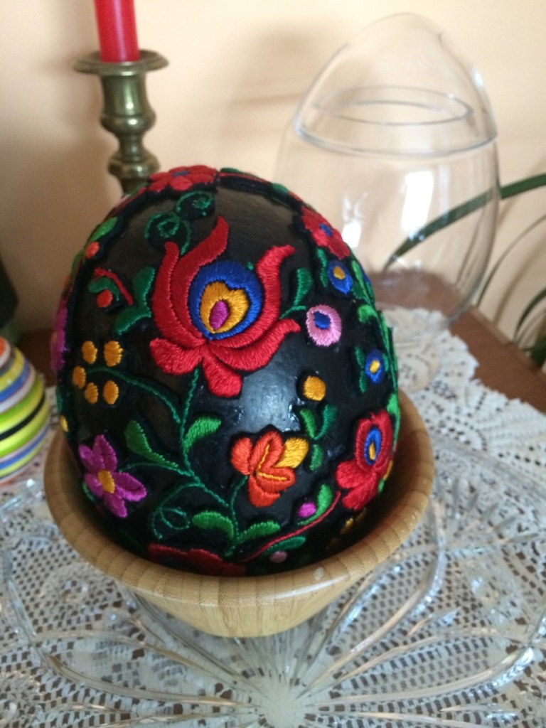 Na stole w pokoju w oczy od razu rzuca się wielkie czarne jajko, na którym są też bajecznie kolorowe wycinanki.