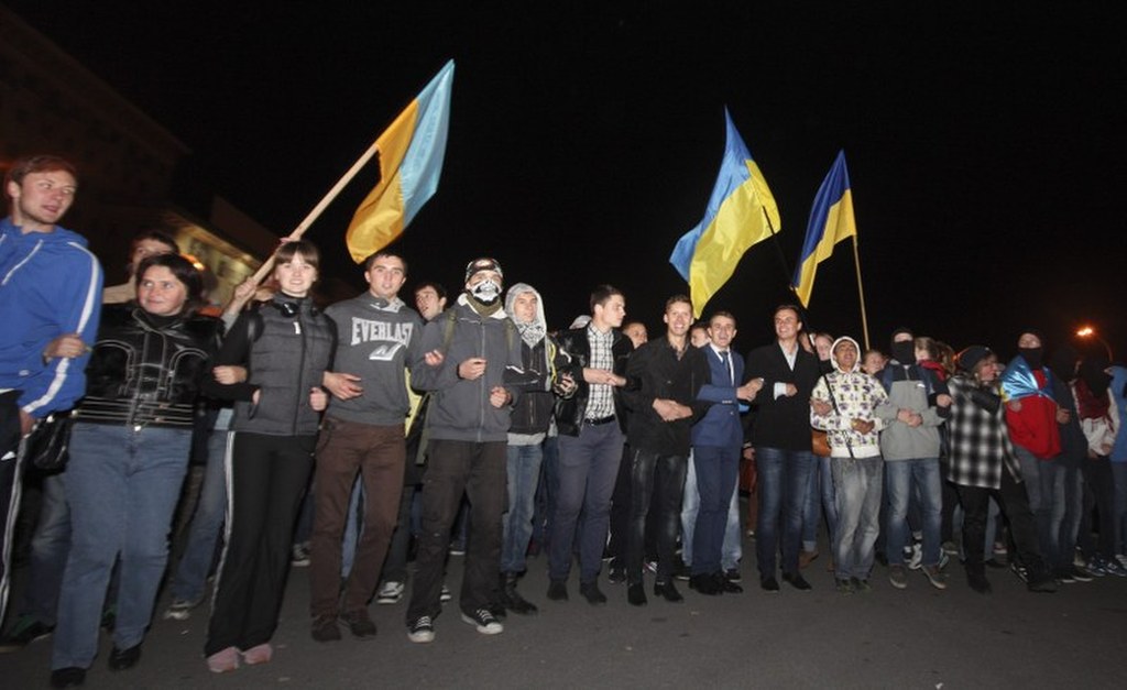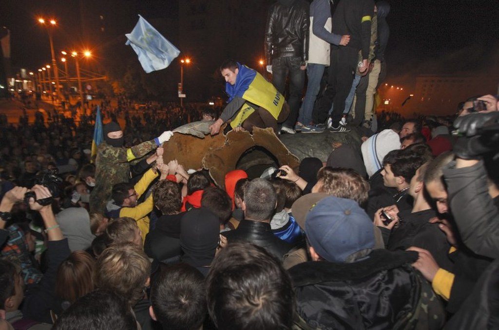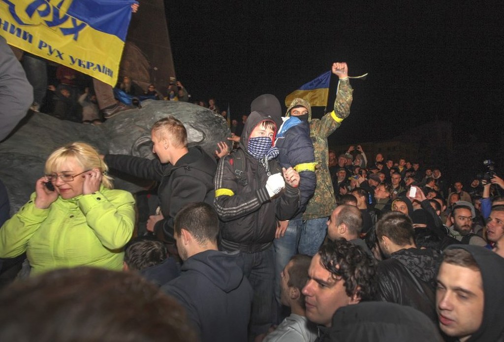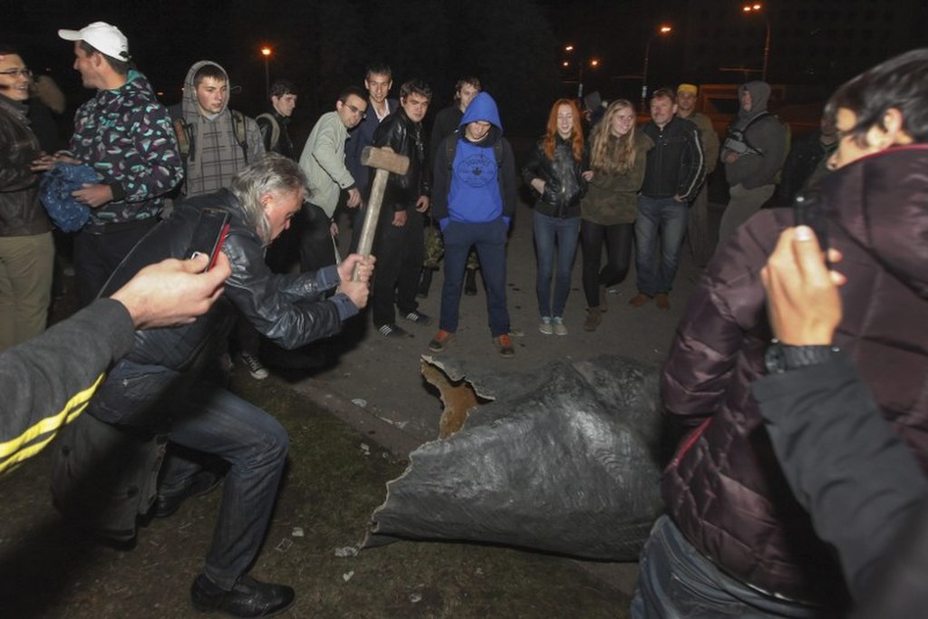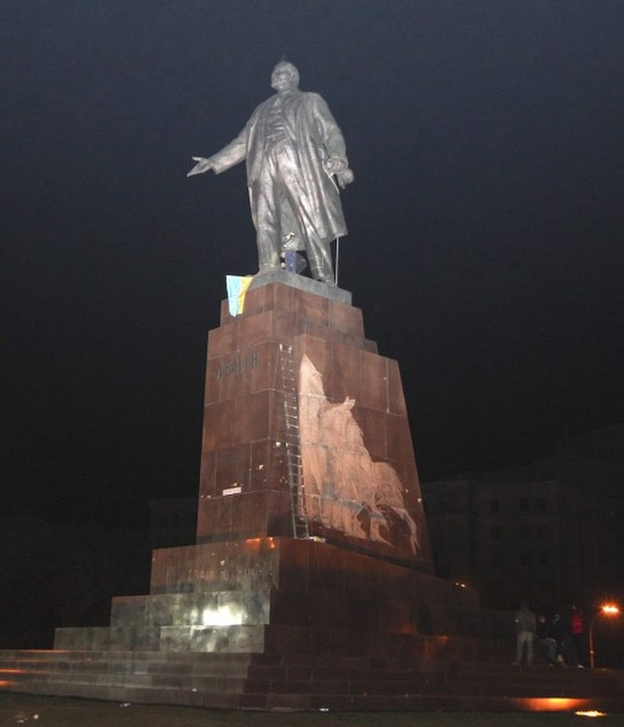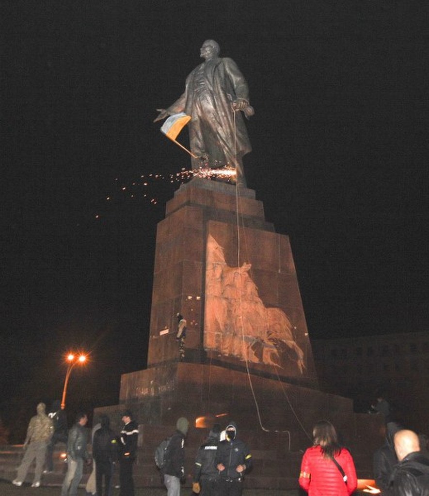 8,5 metrowy posąg Lenina spadł z liczącego 13,7 m postumentu o godz. 22.25 (21.25 w Polsce). Monument obalono po podcięciu nóg postaci przywódcy bolszewików. Obecni przy tym ludzie wykrzykiwali "Ukraina ponad wszystko!" i śpiewali popularną dziś na Ukrainie przyśpiewkę "Putin ch…".
