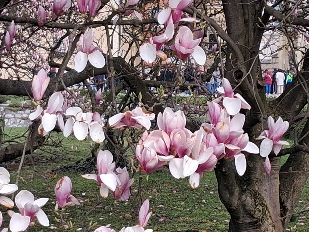 Dla bezpieczeństwa magnolia jest odgrodzona taśmą. To jednak nie przeszkadza krakowianom, którzy tłumnie przychodzą na nią popatrzeć i zrobić jej zdjęcia.