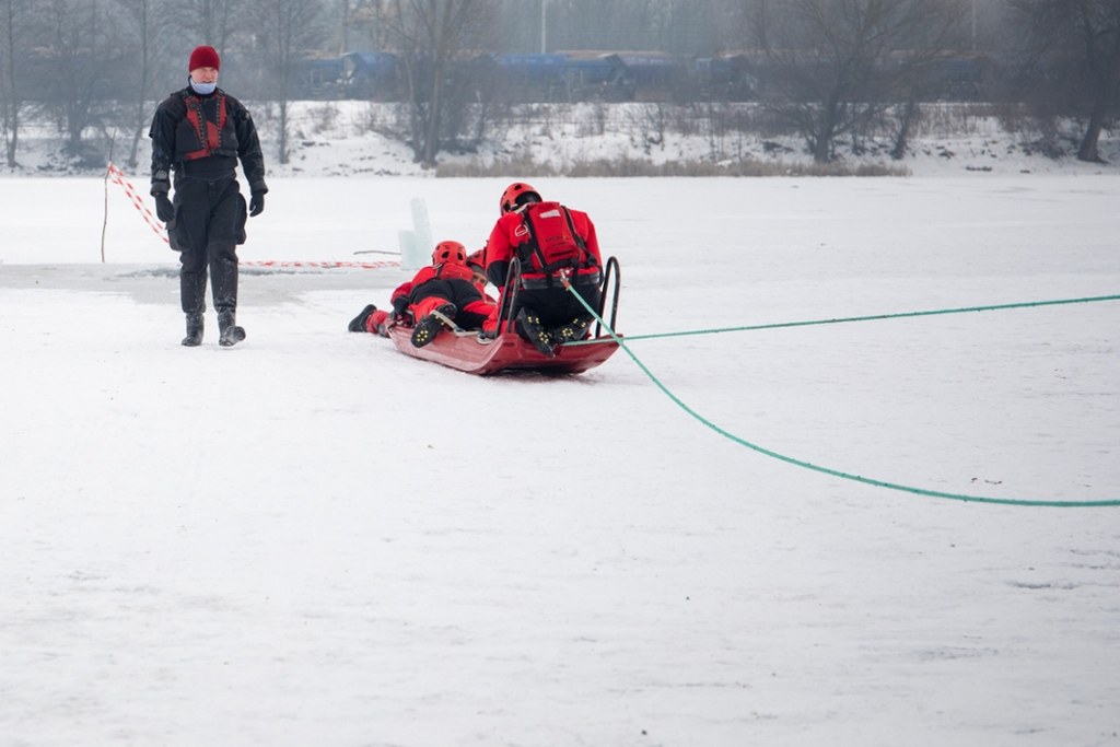 Trzeba uważać na miejsce, w którym się wchodzi, trzeba też umieć odczytać tę pokrywę lodu, czy ona jest bezpieczna dla nas samych jako ratowników i ratujących, czy może również stanowić dla nas zagrożenie. Jak się po tym lodzie poruszać, jaką postawę przyjąć, czym sobie pomóc dostępnym dookoła nas w zależności od miejsca infrastruktury, to wszystko są elementy szkolenia, które staramy się w takiej esencji przekazać kolegom z policji i straży miejskiej - wyjaśnia bryg. Damian Woszczyna Zastępca Komendanta Miejskiego Państwowej Straży Pożarnej w Krakowie