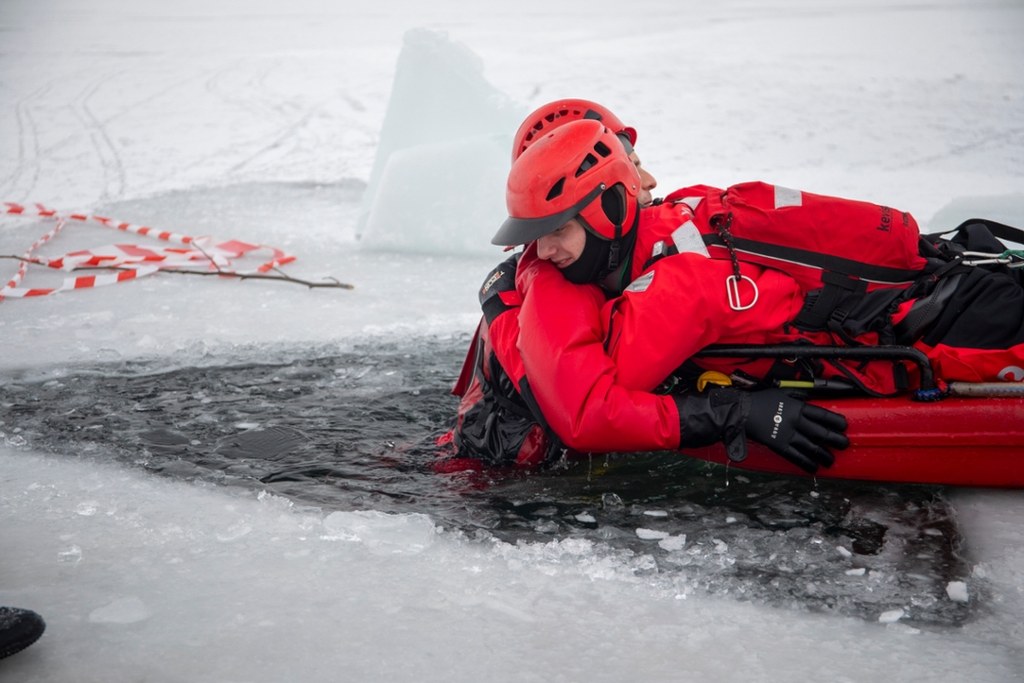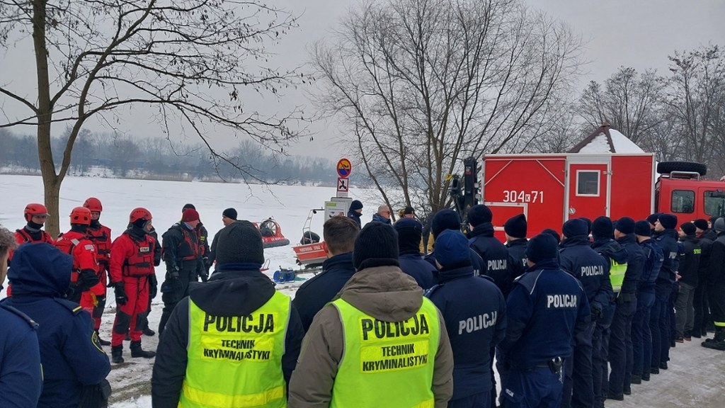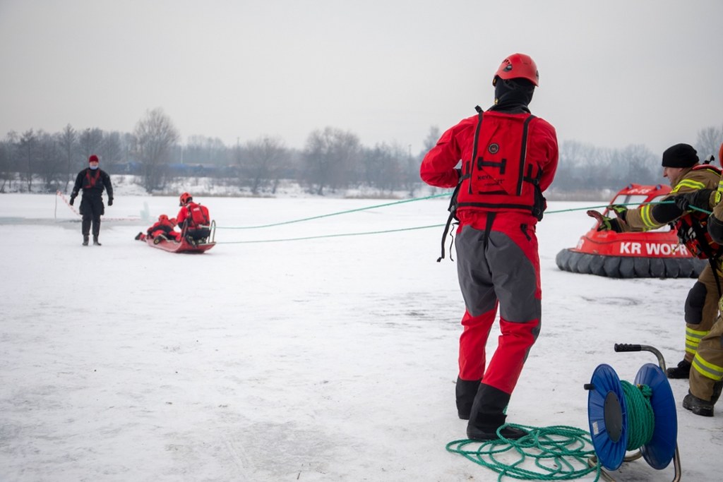 Po części teoretycznej jest ta najważniejsza, czyli praktyka. Służby wykorzystują mróz i ćwiczą na zamarzniętym Zalewie Bagry w Krakowie.