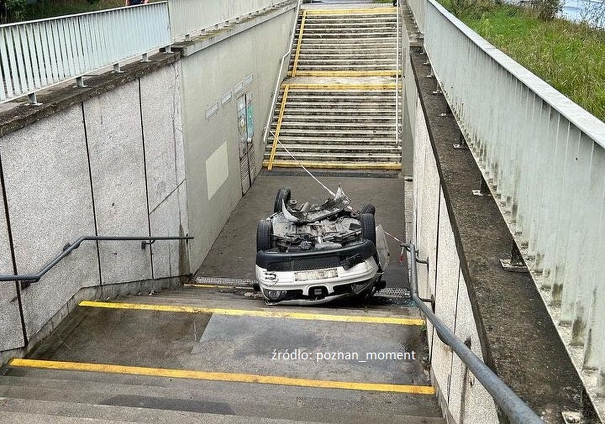 Poważny wypadek przy ul. Dąbrowskiego na poznańskich Smochowicach. Kierowca samochodu osobowego z niewyjaśnionych przyczyn zjechał do przejścia podziemnego.