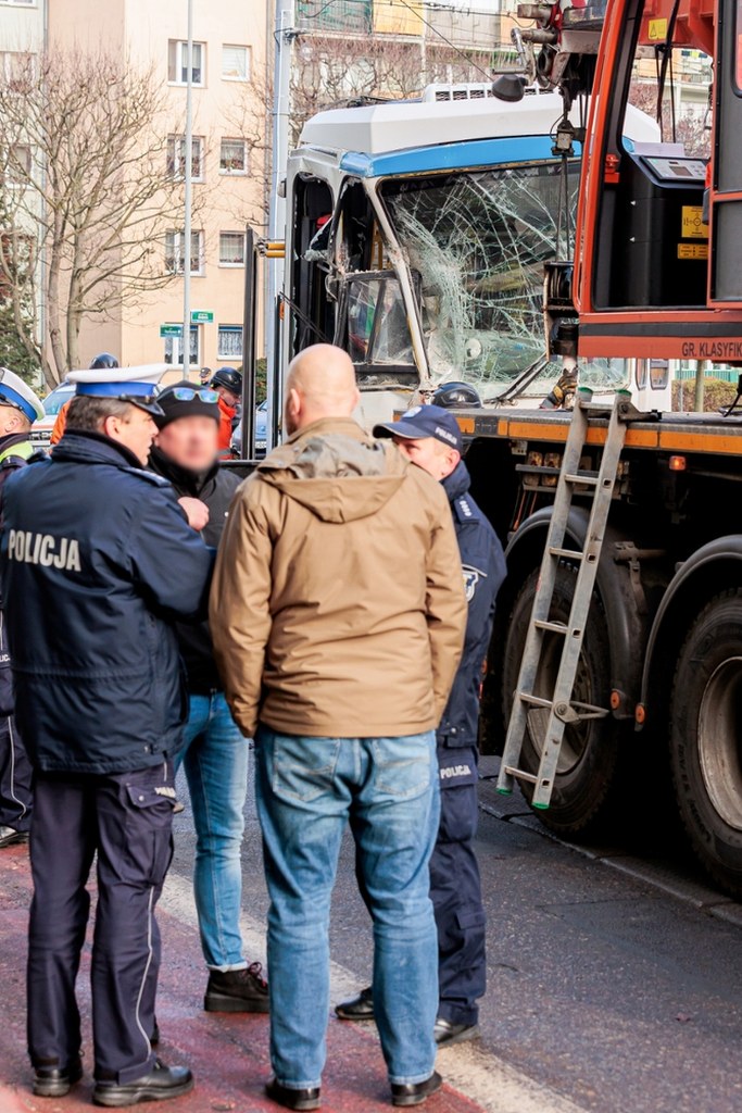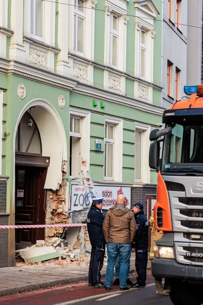 Po wypadnięciu z torów tramwaj szorował po nawierzchni ulicy i uderzył w ścianę kamienicy. Uszkodził elewację w bramie do budynku.