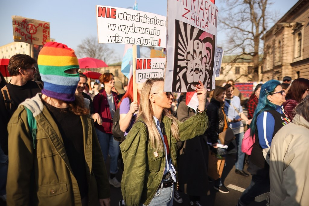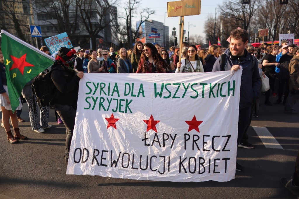 Uczestnicy manifestacji nieśli m.in. tęczowe flagi i transparenty z napisami: "Nie zawieszeniu prawa do azylu", "Matka Polka potrzebuje wolnego", "Syria dla Syryjek", "Łapy precz od rewolucji kobiet", "Dość seksismu, dość kapitalizmu", "Lesbo nie jesteś sama", "Pier... nie rodzę" czy "Życia pełnego intencji, a nie samej egzystencji".