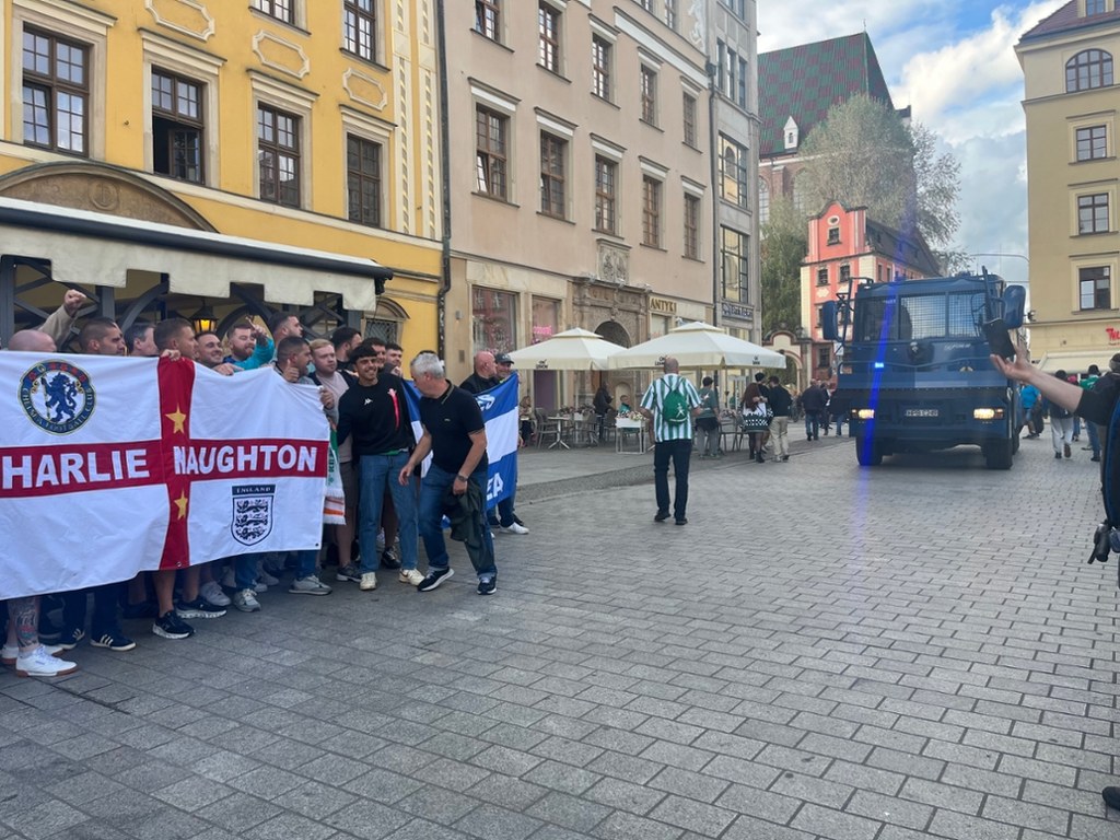 Ponowne starcia kibiców na wrocławskim Rynku przed wieczornym finałem piłkarskiej Ligi Konferencji.