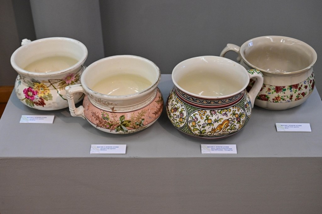 Na wystawie zgromadzono szeroką gamę nocników – ceramicznych, fajansowych, szklanych i porcelanowych.