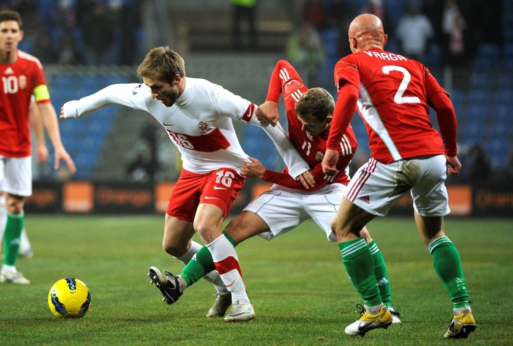 Podopieczni Franciszka Smudy bardzo dobrze rozpoczęli spotkanie i już w pierwszych pięciu minutach stworzyli sobie dwie obiecujące sytuację. W pierwszej Jakub Błaszczykowski uderzył jednak obok bramki, a Adrian Mierzejewski trafił w boczną siatkę. Pomocnik Trabzonsporu dobrą okazję miał także w 24. minucie, ale jego mocne uderzenie z rzutu wolnego bardzo dobrze obronił węgierski bramkarz. Dużo więcej problemów miał ze strzałem Mierzejewskiego w 37. minucie i po niepewnej interwencji Paweł Brożek z najbliższej odległości skierował piłkę do bramki.