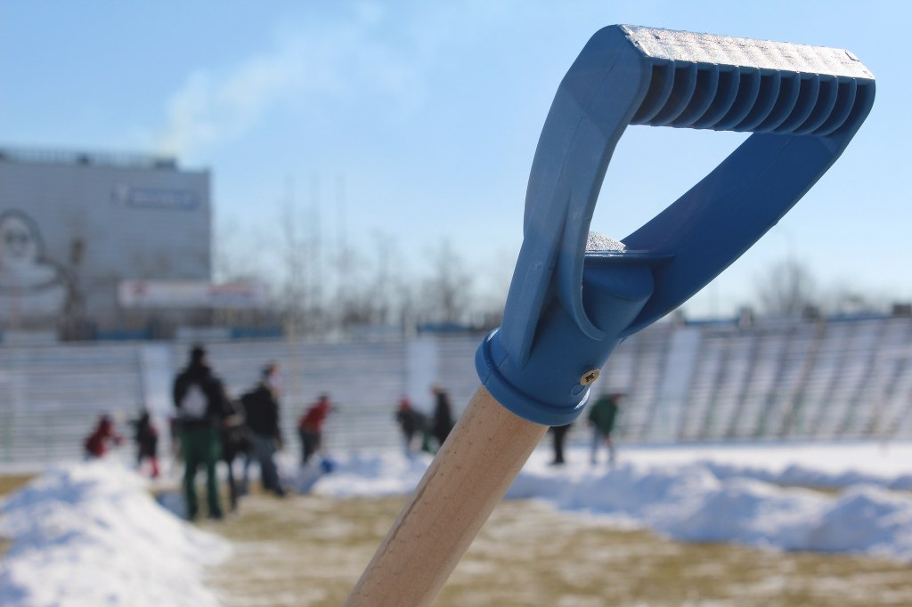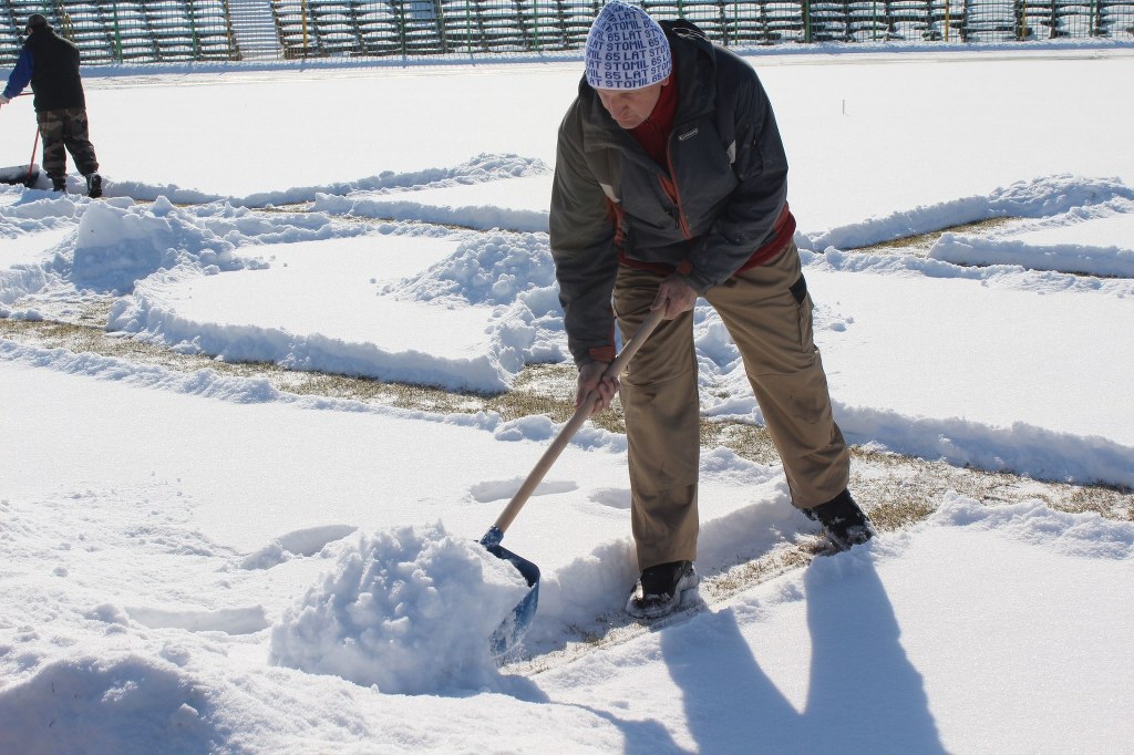 Dzisiaj rano murawa olsztyńskiego stadionu była pokryta nawet 20-centymetrową warstwą śniegu. Niestety z uwagi na trawę nie można było użyć ciężkiego sprzętu. To jednak już przeszłość. Dzięki pomocy kibiców udało się odśnieżyć stadion.