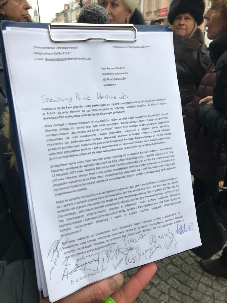 Poszkodowani przez GetBack próbowali złożyć petycję w kancelarii Romana Giertycha