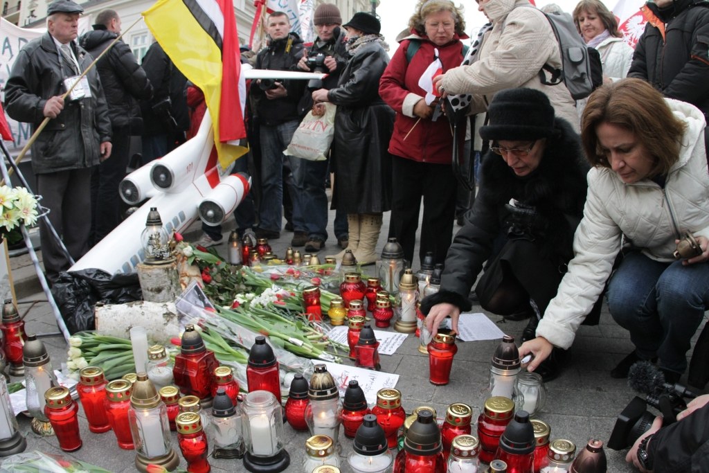 Przed Pałacem Prezydenckim zgromadzą się ludzie, którzy zapalają znicze przy modelu rządowego Tu-154M / PAP/EPA