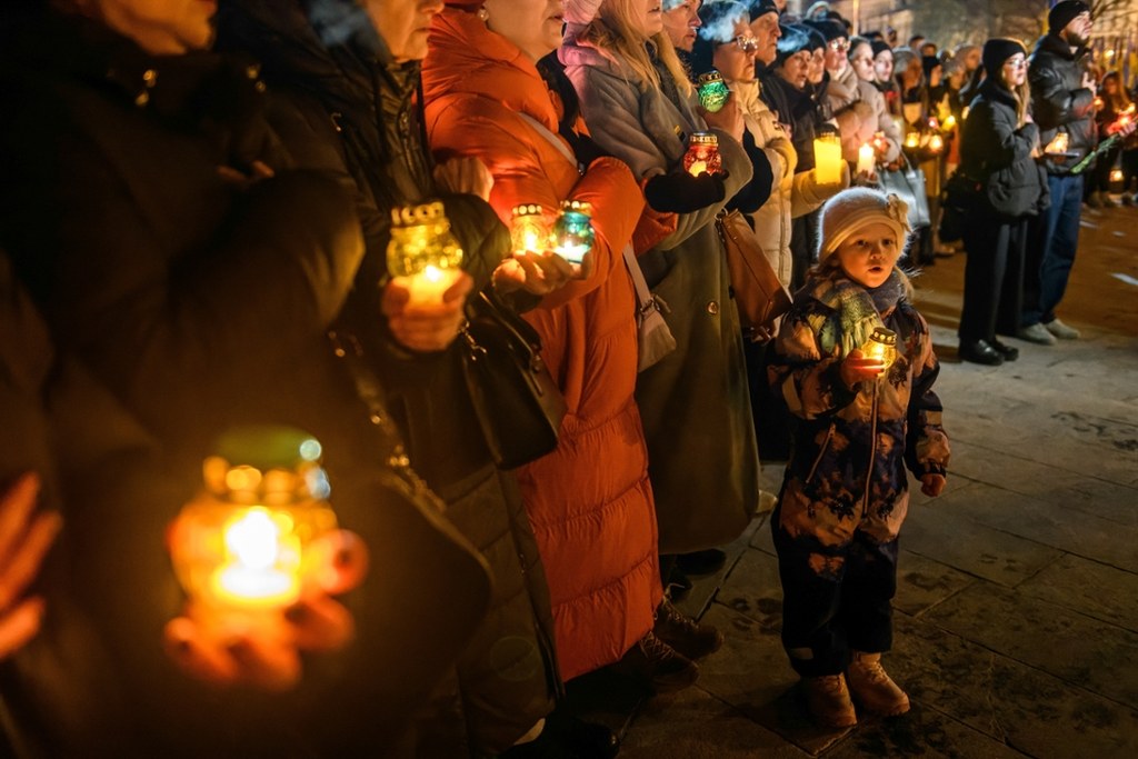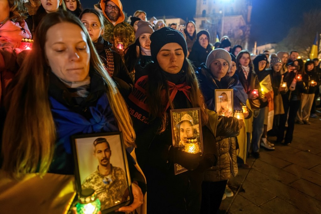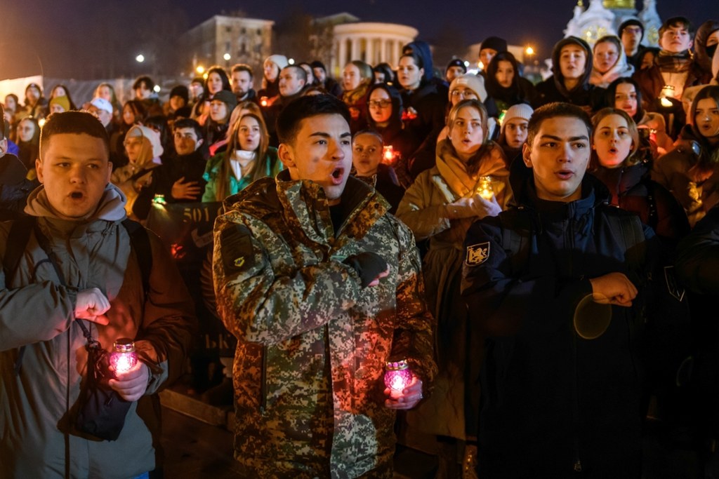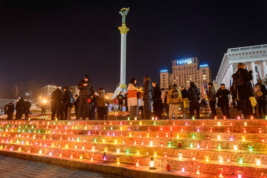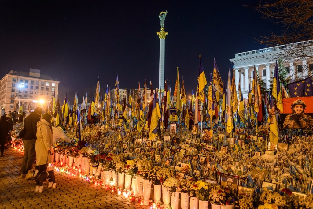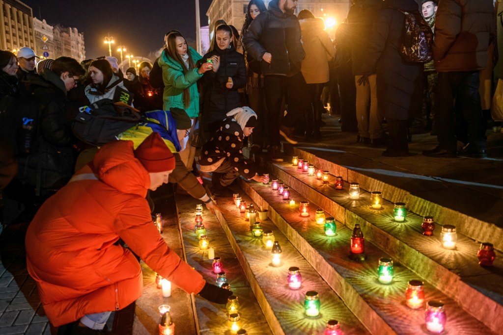 Zapalone świece ku pamięci poległych żołnierzy Sił Zbrojnych Ukrainy, w trzecią rocznicę pełnowymiarowej inwazji Rosji na Ukrainę, na Majdanie Niepodległości w Kijowie / fot. Vladyslav Musiienko / PAP