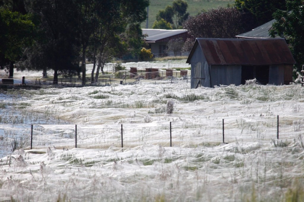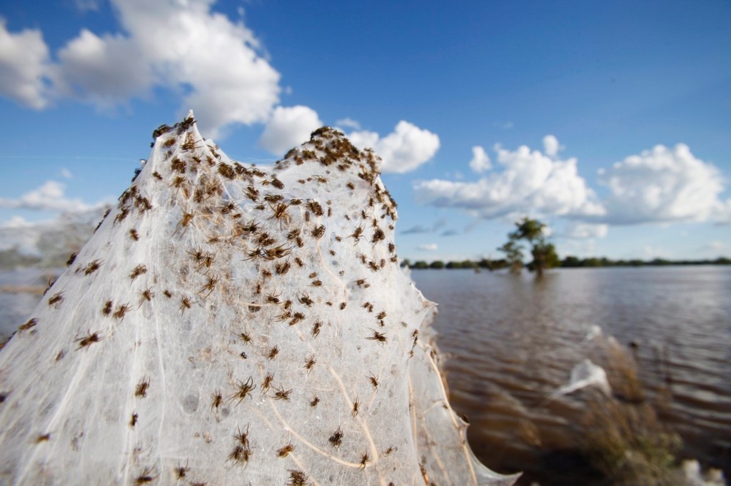 Mieszkanka Wagga Wagga obserwuje zalany teren i gigantyczne pajęcze sieci. / PAP/EPA
