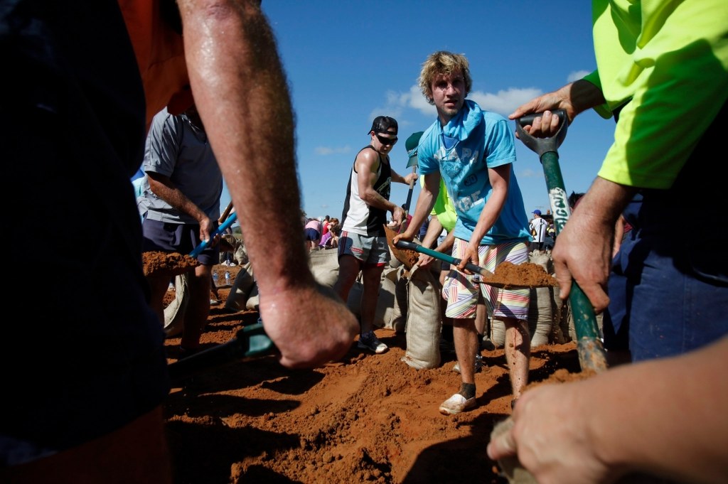 Ochotnicy napełniają worki z piaskiem. / PAP/EPA
